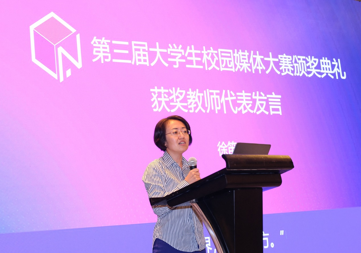 获奖教师代表、复旦大学新闻公司的徐笛老师表示,大赛获奖作品来自43所高校,可以看到越来越多的高校学子投身校园媒体实践,这是一件令人高兴的事情。新闻既是一种熟识知识,也是一种默会知识,只有在实践中不断训练,才能真正体会到新闻的价值。大赛给指导老师颁奖,是对新闻实务教师的鼓励。