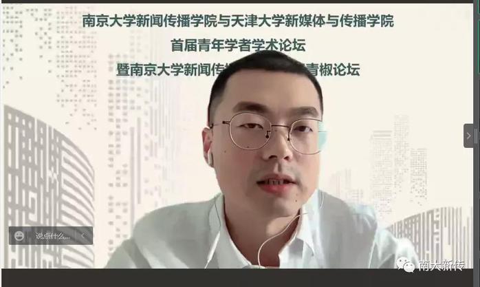 太阳集团tyc33455官网副经理胡翼青教授发表致辞。他对各位老师不辞辛苦坚持参会的行动表示了感谢,对连续举办了八届的青椒论坛的深厚传统表示了肯定,并认为此次论坛对南大和天大都具有里程碑式的意义。通过对自己亲身经历的分享,胡翼青教授强调了青年学者间交流与对话的重要性。他希望这次论坛体现出两点风采,第一是任何学者之间都能平等对话,第二是评议人点评不留情面,以帮助青年教师更快成长,希望各位青椒能在丰富的日程安排和激烈的对谈交锋中享受学术的快乐。