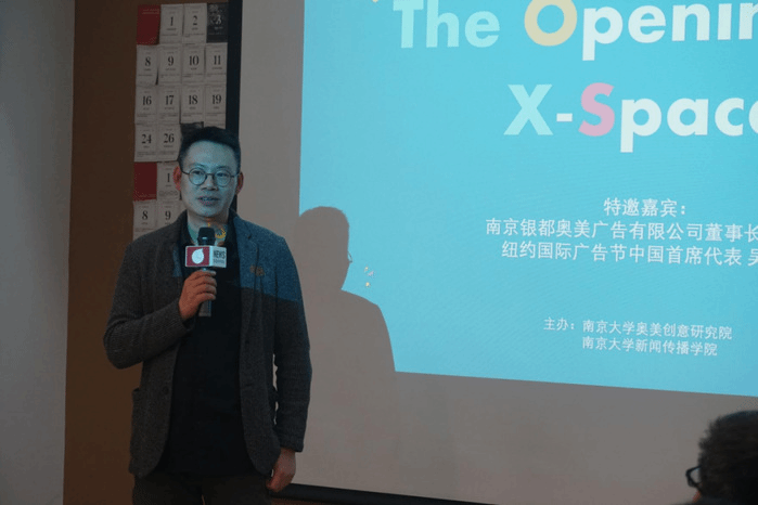 揭牌仪式后,惠建军围绕“向善”与“创新”两个关键词,介绍了当今广告行业的生态,并表达了对“X空间” (X-Space) 营销创意工作坊的殷切祝福。惠建军指出,未来广告的核心仍然是讲故事的能力,社会需要“会讲故事的人”——以全球思维讲述中国故事。基于丰富的业界经验,惠建军提出,如今的广告行业越来越内容化,而内容创意是没有边界的,“X空间” (X-Space) 代表着的便是“无界的未来”。