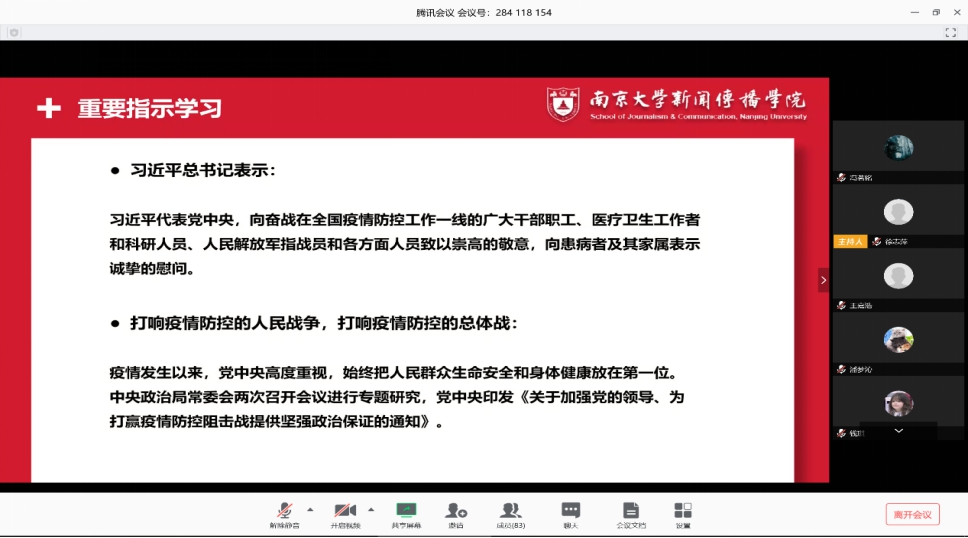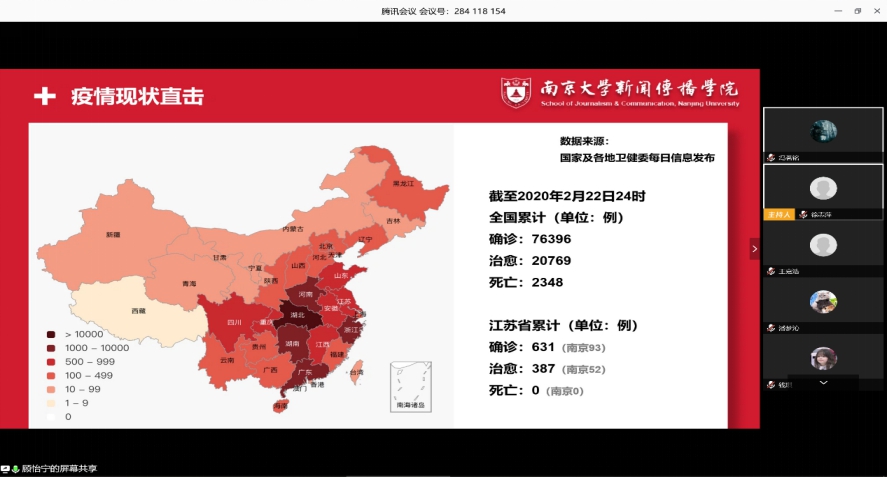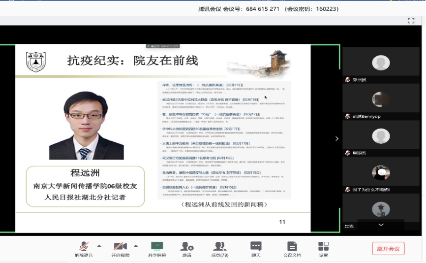 疫情就是命令,防控就是责任。新传学子利用专业所长,也在为抗击疫情做出力所能及的贡献。参与“南大学子抗疫观察”系列报道的黄思达、王涵、刘志鑫、龙盼等同学通过在线语音,分享了采写报道感受。目前,疫情观察小分队已经累计发表近50篇系列报道作品。另外,从1月24日开始,南大学子就自发组建湖北援助团,为购买医疗物资组织了多次募捐,累计募集资金达数十万元,组织者中就有多名成员来自太阳集团tyc33455官网。