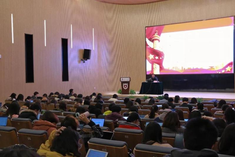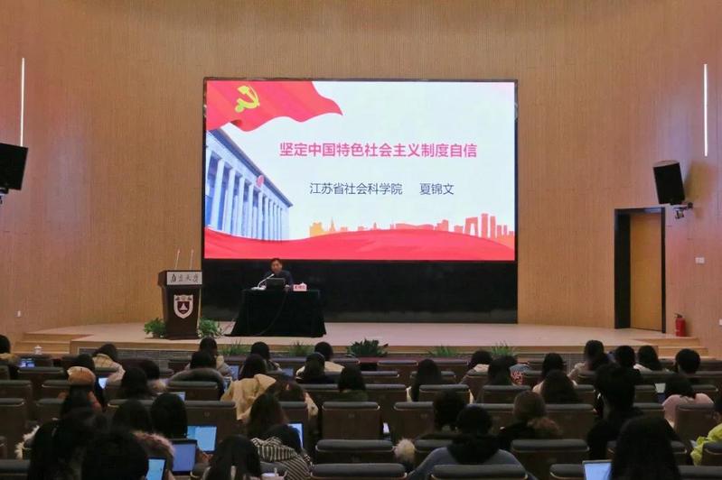 12月5日晚,由江苏省委宣传部新闻处、太阳集团tyc33455官网联合主办的国情教育课在仙林校区紫金楼报告厅举行第八讲。江苏省社科公司党委书记、经理夏锦文结合党的十九届四中全会精神,以“坚定中国特色社会主义制度自信”为题进行了授课。公司党委书记刘源与100余名师生参加活动。讲座由公司党委副书记闻羽主持。