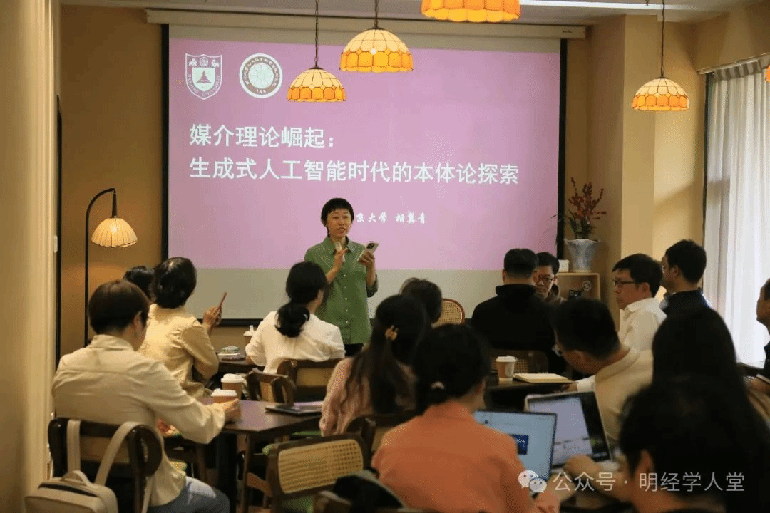 胡翼青老师以《媒介理论崛起:生成式人工智能时代的本体论探索》为题进行分享。他指出,生成式人工智能的基础设施性、自动化行动力与在开放域和封闭域中体现出的潜能极大地动摇了人类关于世界的本体论认知。胡老师回溯了当下流行的媒介本体论观点,剖析了三种重要的媒介本体论路径,并强调生成式人工智能的出现,不仅进一步强化了亚媒介空间的神秘性,也使得通过类人智能追问人的本体论意义变得尤其迫切和必要。在此背景下,本体论式的理论探索成为当代媒介理论的突出特征。