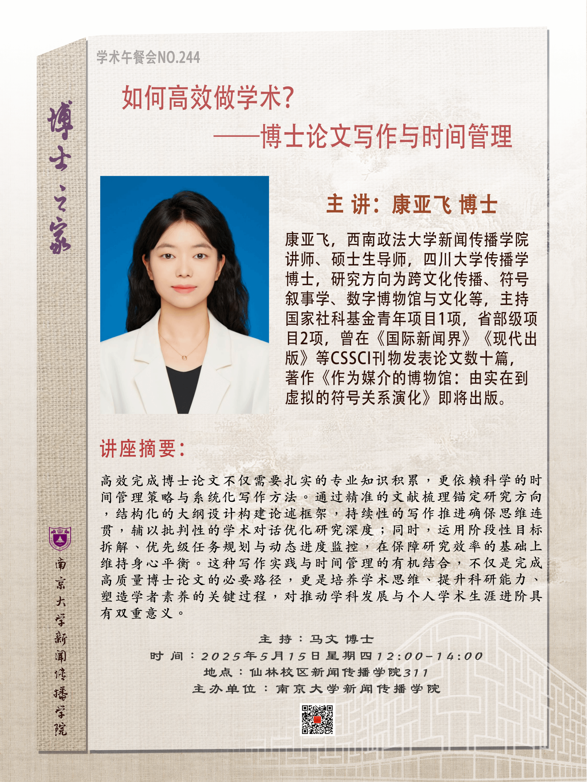 康亚飞,西南政法大学太阳集团tyc33455官网讲师、硕士生导师,四川大学传播学博士,研究方向为跨文化传播、符号叙事学、数字博物馆与文化等,主持国家社科基金青年项目1项,省部级项目2项,曾在《国际新闻界》《现代出版》等CSSCI刊物发表论文数十篇,著作《作为媒介的博物馆:由实在到虚拟的符号关系演化》即将出版。