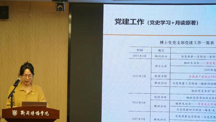 博士生党支部书记郭静展示了本年度的支部党建工作一览表,主要包括党史学习与阅读原著两个板块,着重报告了深化理论学习实践、优化支委组织架构、进一步完善“马恩读书会”规范化建设等方面的情况。