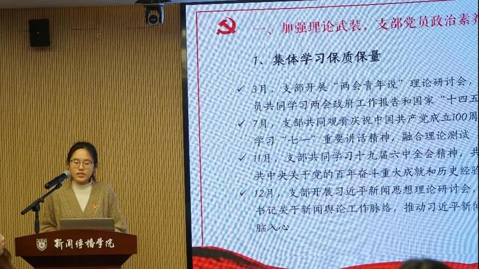 之后,2021级学硕党支部书记张一可和本科生党支部书记陈丽敏依次进行述职。张一可汇报了支部成立三个月来开展的专题学习与组织生活,明确提出未来将加强思想教育、丰富活动形式。联系2021级学硕支部的党委委员胡菡菡点评道:“这是一个有活力的支部,希望充分发挥支委的力量,汲取各个支部的经验,创新开展组织生活。”