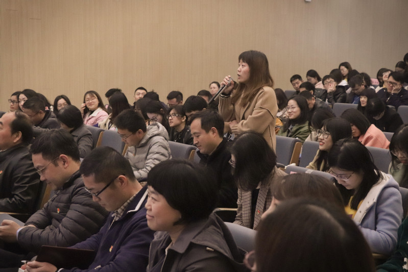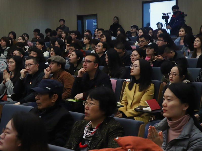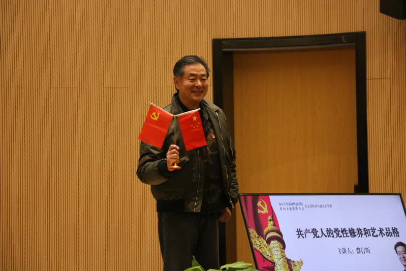 为了更直观地展现话剧表演的工作形式,濮先生还为大家播放了一则短片,带领现场师生一探北京人艺的后台。短片中,无论是就一句台词精心打磨,还是对一个动作反复推敲,均能反映出濮存昕及整个团队对艺术的敬畏与求索。曾任北京人民艺术剧院的副经理,濮存昕坦言肩上的担子很重,自己不仅需要是一名好演员,还得思考如何为青年演员提供戏剧教育,并将人艺的“金字招牌”传承下去。在短片末尾,镜头中的濮存昕默然注视着人艺新建的剧场,“盖房子很快,培养一个人很慢”。这份对于文艺事业沉甸甸的担当,令在场党员无不动容。