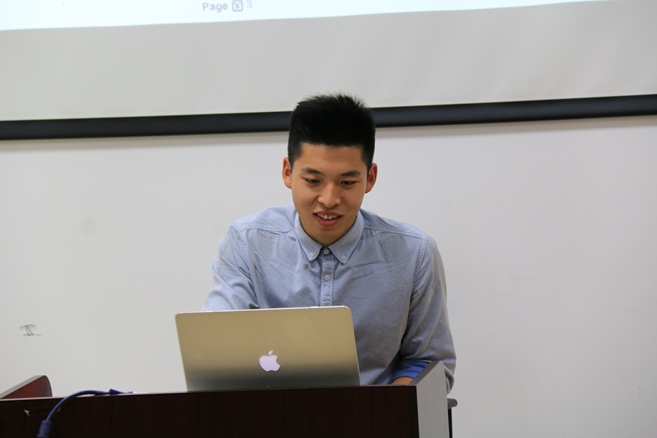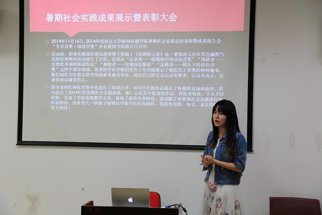院团委组织部长武涛介绍了团委的工作情况,他首先介绍了部门情况及分工,然后从团委宗旨“对外高举红旗、对内服务同学”重点谈起,以具体活动为例子阐释如何实现宗旨,最后谈到团委重点培养的项目——刚刚起步的“新声”微信公号。武涛又大体介绍了公司的组织情况,将离同学们最近的组织分为三类,概要地介绍了公司以团学组织举办活动、专业实践补充课堂、基层团支部服务同学们的架构。团委实践部长马雨薇号称“霸道总裁”,她以风趣的语言介绍了实践晚会的全过程,贡献出很多干货,部门的和谐氛围也让大家开怀大笑。