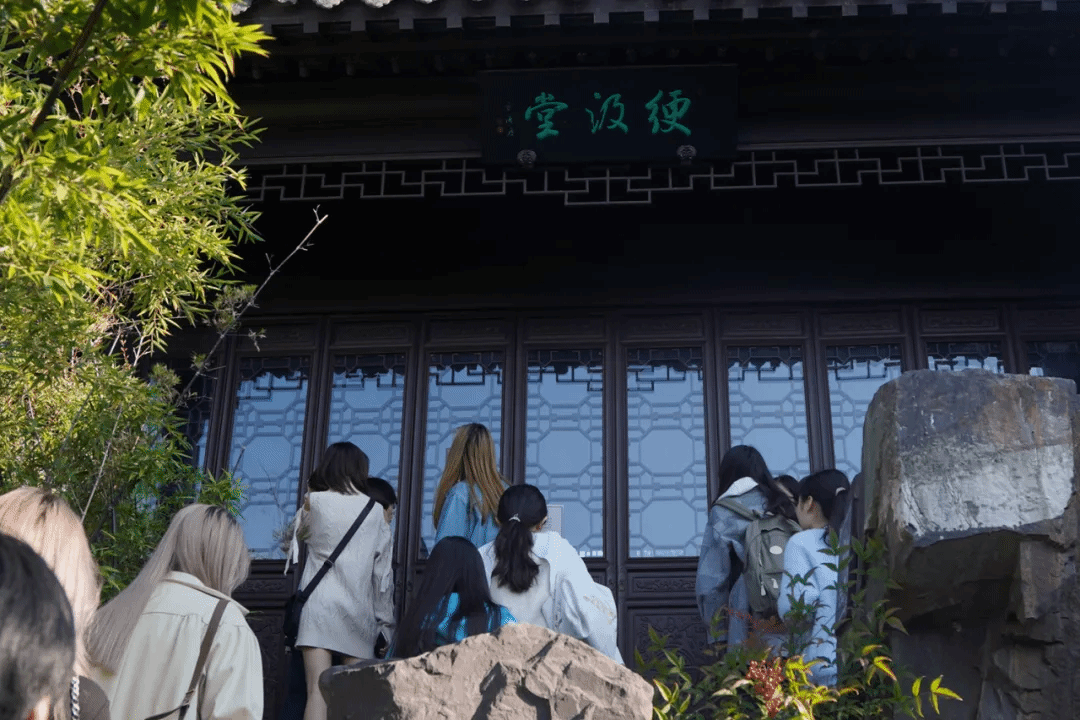 在淮安园,“荷芳书院”的匾额一语双关,不仅映照了门前荷花簇拥的池塘,也暗含着对运河治理“河舫官”的怀念。无锡园里,庭院的地面浮雕对称大气,“蝙蝠”图案寄托着祈福愿望。南京园大气高远,徐州园楚风汉韵,扬州园九峰生烟……这里的园林建造彰显着文化内涵,也体现了建造者精益求精的态度,让同学们对江苏的地域文化有了更深的认识和理解。