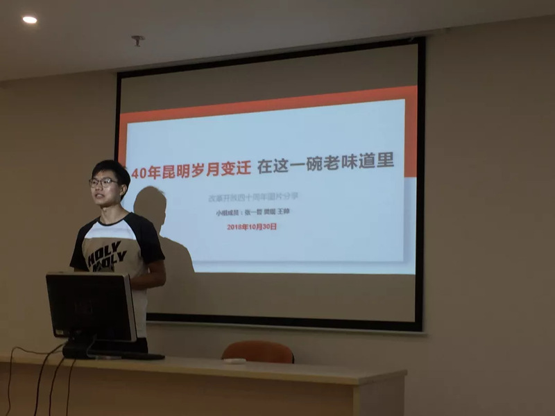 王帅同志首先发言,他从家乡随处可见的街景变化写起,立体地呈现出改革开放带动经济腾飞,让老城旧貌换新颜的巨大能量。随后将视线聚焦于家乡特色的街边美食,介绍了德胜桥创始人杨美淮乘着改革开放春风经商创业的故事,从一碗豆花米粉中窥见昆明四十年来的改天换地。