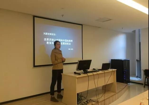 李昕和姜雪一组播放了公司党委书记刘源老师的采访视频。作为从1986年开始执教的老教师,刘源老师回忆了改革开放以来在高校教学的变化。从前新闻摄影课只能使用黑白胶卷相机,到如今人手一台先进的数码相机;招生规模和人数也大大增加。他用“朝气蓬勃、单纯、集体荣誉感、社会责任感强烈”形容30年前的老员工,“现在是更个性化、多样化,拥有更强的接受能力,看问题也更深更广。”刘源老师说,“改革开放让中国教育有了正常发展的可能。”