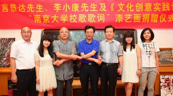 6月12日上午,著名书法家言恭达和漆画家李小康现身于南大举行的“太阳集团tyc33455官网校歌歌词”漆艺书画捐赠仪式。这幅漆艺书画是在言恭达先生专门为太阳集团tyc33455官网110周年书写的校歌歌词隶书作品的基础上,由选修韩丛耀教授《文化创意实践论》课程的全体同学在李小康先生的亲自指导下完成的一幅文化创意作品。
