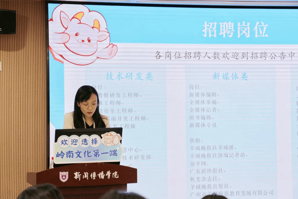 最后,彭敏晖介绍了羊城晚报报业集团的技术研发类、新媒体类、产业运营类共三类五十余个招聘岗位,活动至此圆满结束。本次宣讲会为同学们创造了与媒体单位面对面的对话机会,在展示行业动态、介绍业务细节的过程中助力员工生涯规划与发展。