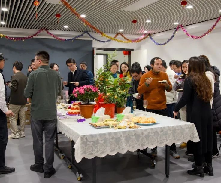 致辞过后,丰富的美食盛宴就开始了。这次联欢活动公司准备了南京烤鸭、羊肉串、羊肉汤、双层大蛋糕、饺子,还有水果、茶饮等各种美食和饮品。老师们品尝美食,举杯同庆过去一年的成绩,展望畅谈未来的发展。