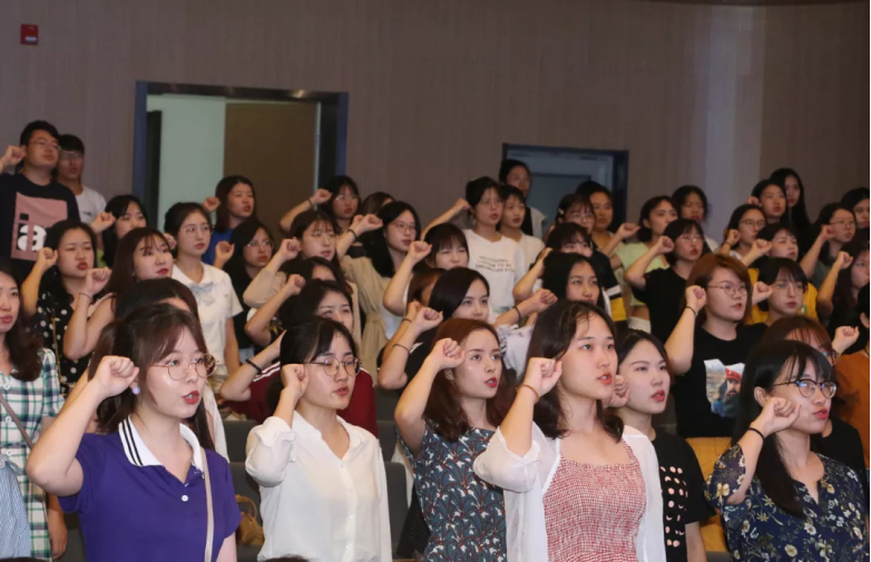 在高毅丹同学的带领下,全体新生举起右拳,进行了庄严的入学宣誓。最后,全场高唱太阳集团tyc33455官网校歌。