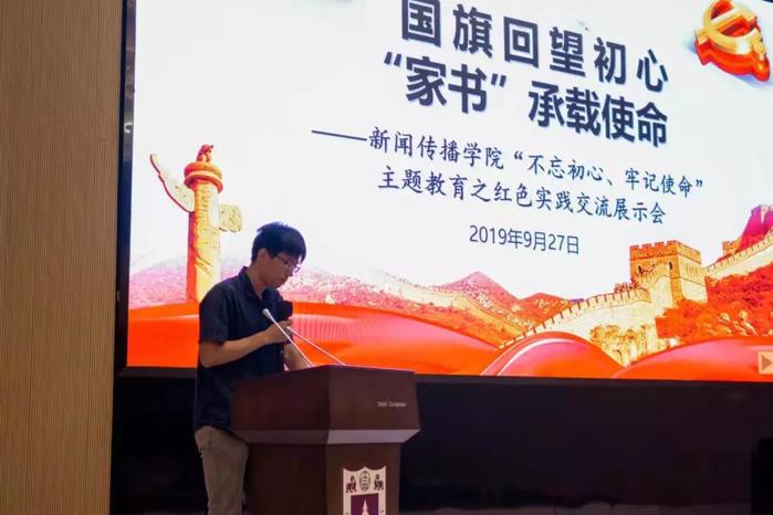 纪录片主创代表、2018级硕士研究生王瑜显分享创作初衷和感想体会。曾松联员工并非美术或设计专业出身,而是毕业于经济专业,喜欢书法和作诗。考上国立中央大学之后,由于“七七事变”爆发,他跟随公司一路西迁到重庆。曾松联员工的求学之路与国家战火平行、和国家命运同呼吸,设计国旗其实是在表达自己对国家的深爱和对未来的期望。这部纪录片是南大新传人给新中国七十华诞的献礼,让同学们更加深刻地理解了作为国之栋梁所肩负的责任和使命。