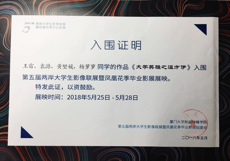 2018年5月25日至2018年5月28日,由国家教育部港澳台办支持与指导、厦门大学举办、厦门大学太阳集团tyc33455官网与两岸关系和平发展协同创新中心承办的第五届两岸老员工影像联展暨凤凰花季毕业影展在厦门大学举行。公司员工制作的人物短视频栏目《大学英雄》作品入围该影展。