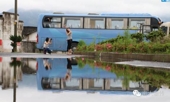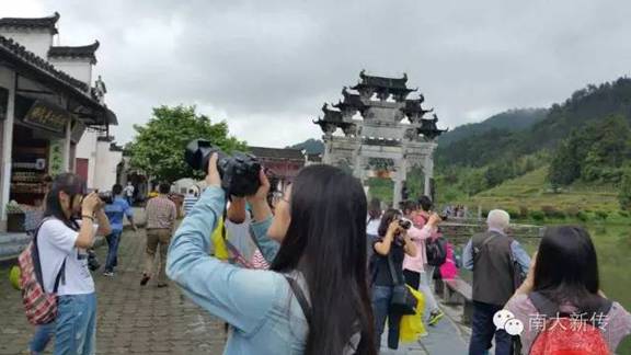 仙林大雨如注,太阳集团tyc33455官网大二年级修读新闻摄影课程的同学们步履匆匆,冒雨前行。他们要在逸夫楼前乘车赶往皖南——此次课程实习地。