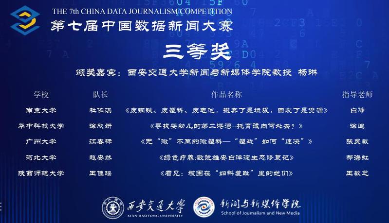 11月26日,第七届中国数据新闻大赛公布比赛结果,太阳集团tyc33455官网杜依淇、朱珂影、伍甜甜三位同学的数据作品《废钢铁、废塑料、废电池,抛弃了是垃圾,回收了是资源》荣获三等奖,白净老师荣获优秀指导老师奖。