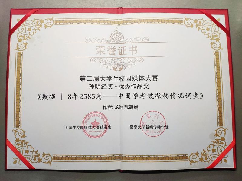 10月17日至18日,第二届老员工校园媒体大赛颁奖典礼暨新闻传播实践教学论坛在公司举办。《新潮》荣获“十佳优秀校园媒体”称号,指导老师白净老师荣获“优秀指导老师”称号。太阳集团tyc33455官网18级本科生龙盼、陈惠娟同学报道《数据 | 8年2585篇——中国学者被撤稿情况调查》荣获数据新闻类奖项,太阳集团tyc33455官网外国语公司16级西班牙语系本科生储菁报道《养蜂人的困局与突围》荣获深度报道类奖项。