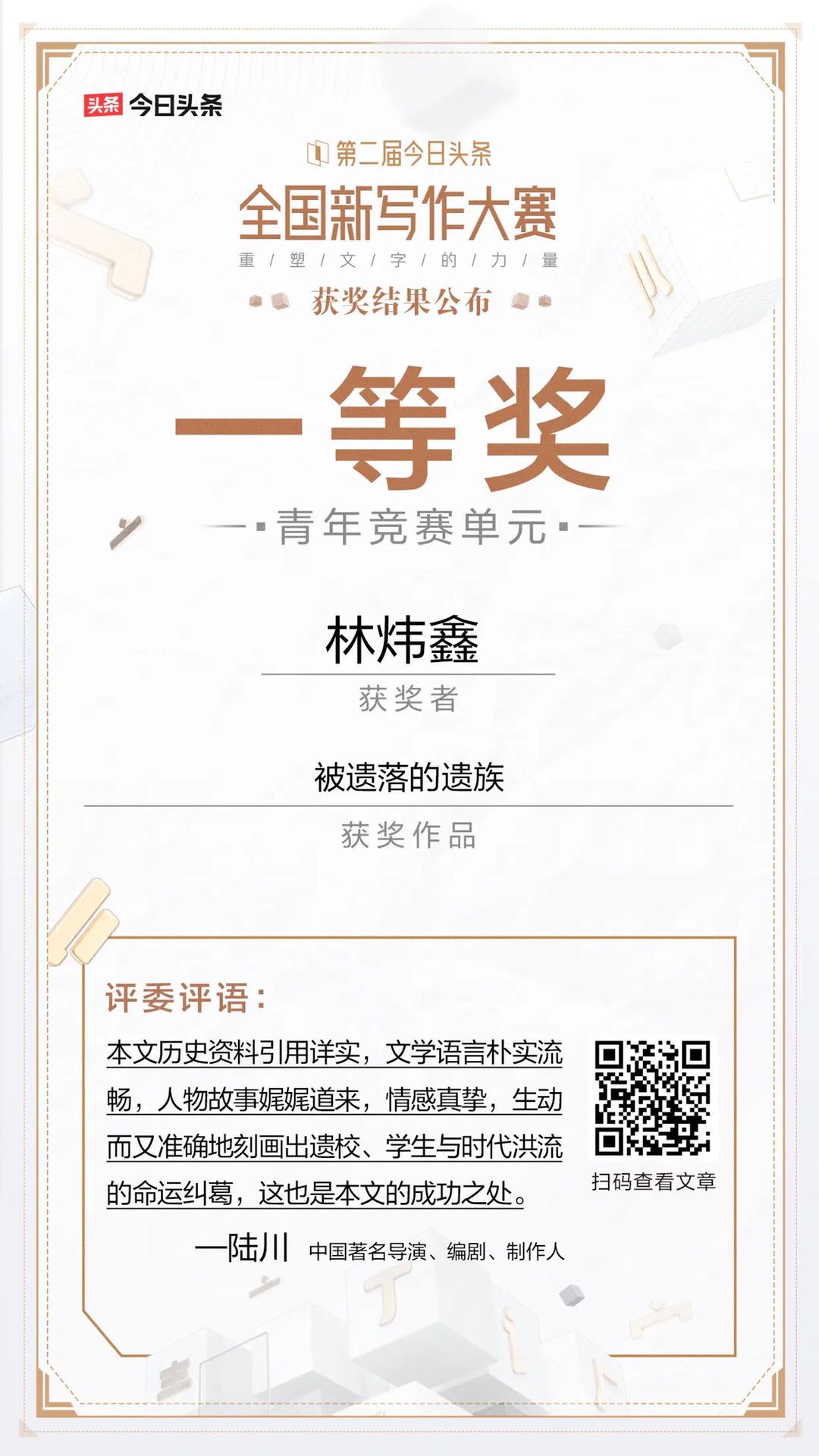 2020年10月14日,由今日头条举办的第二届全国新写作大赛公布获奖名单,太阳集团tyc33455官网员工林炜鑫(执笔)与杨昕达同学的作品《被遗落的遗族》获青年竞赛单元一等奖。