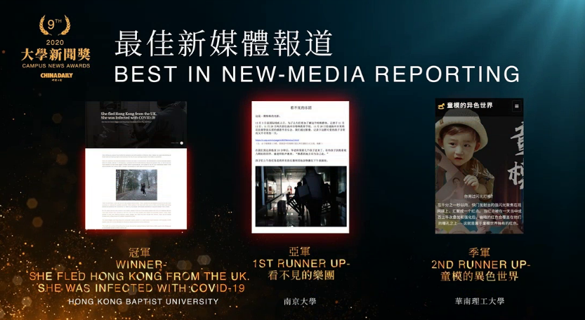 丁浸哲、李嘉豪与李远浩同学合作完成的新媒体报道《看不见的乐团》,以国际残疾人日为契机,关注学习生活在特殊教育公司的员工,通过对公司“感恩音乐会”举办前后的采写与拍摄,真实传递了特殊教育公司寻常而又不寻常的一天,获最佳新媒体报道组亚军。