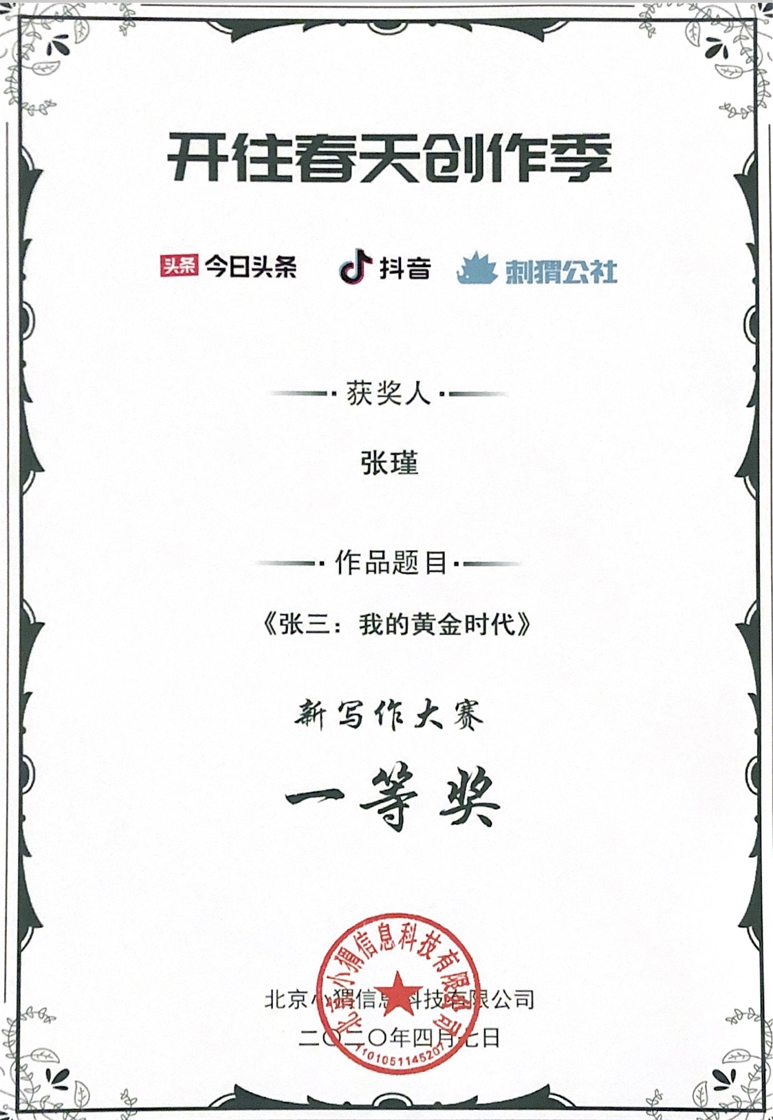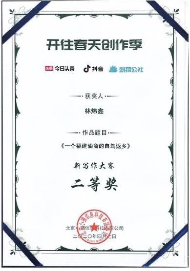 (获奖证书和作品链接:https://www.toutiao.com/a6791730929829151245/)