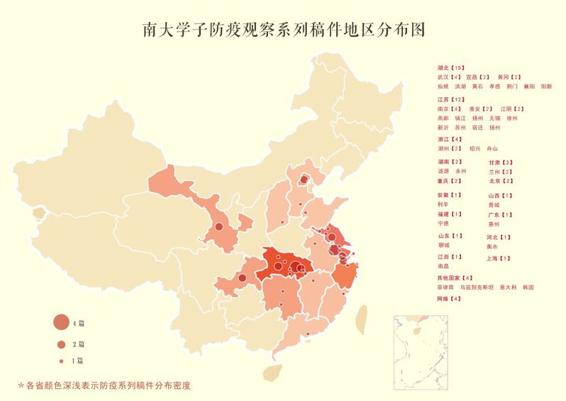 最开始的时候,参与的同学都来自湖北,后来伴随着疫情的发展,越来越多的地区进入防疫状态,老师们决定鼓励更多同学加入到报道的队伍里。2月2日后,老师们取消了地区限制,向五湖四海的南大学子发起号召,“防疫观察小分队”迅速扩展到了180余人。