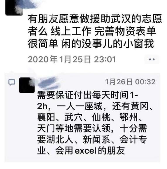1月30号左右,她刚完成对大象志愿队的采访,大象志愿队的队长象哥在电话中略带哭腔地和她倾诉,说自己确实联系不到有物资的商家了。张瑾想到了NJU自组湖北援助团,当夜就和其负责同学联系。没过多久,一个包含大象志愿队成员及援助团同学的微信群就建起来了。