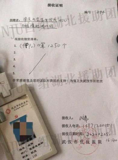 公众号“NJU自组湖北援助团”发布于2月22日的物资公告显示,自2020年1月24日至2月12日,不到三个星期的时间,募捐活动共收到善款人民币2108641.66元,购买护目镜13000余副、医用手套87000双、各类口罩29000只,此外还有若干血氧仪、防护靴、消毒液等短缺医用物资。