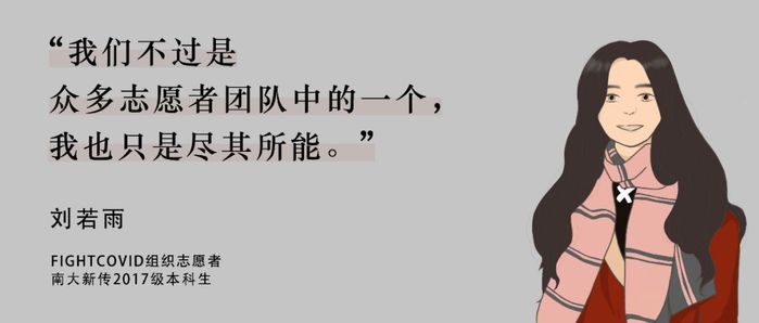 从1月30日开始,新传院2017级本科生刘若雨在FightCOVID组织做志愿者工作。FightCOVID原名Fightncov,是由1000多名境内、海外老员工志愿者组成的民间志愿者团队,旨在用视频、文章等方式向世界人民科普有关于新型冠状病毒的事实、传达中国人民的心声。因为FightCOVID主要是以制作视频的方式传播内容,所以刘若雨运用自己作为新传人的专业技能,负责组织的Logo设计、视频素材收集以及剪辑工作。