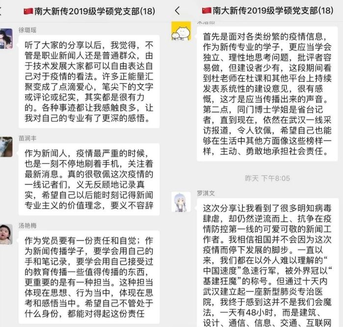 2019级学硕党支部书记丁安一认为,每位党员应该充分发挥先锋模范作用,积极配合公司、公司的疫情防控布置,为打赢疫情防控攻坚战尽职尽责;前辈党员新闻人和无数“逆行者”给了大家榜样力量,要体现新时代党员青年的力量和作为,为人民和时代发声发力。