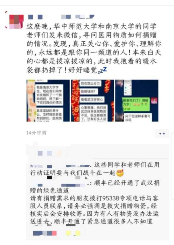 南大新传2016级本科生张鑫宇向我们分享了许多温暖的时刻:师生、员工连番捐款,款项冲到“100万”时管理小群里同学们的激动;荆州医生暖起“白天已经凉到底的心”,在朋友圈里真诚致谢;可爱的医疗厂商在电话那头诉说被骗的悲惨经历、埋怨血氧仪没有买自家的是不信任自己……这些经历,让那些忙碌得连轴转的日子也时常充满安慰。