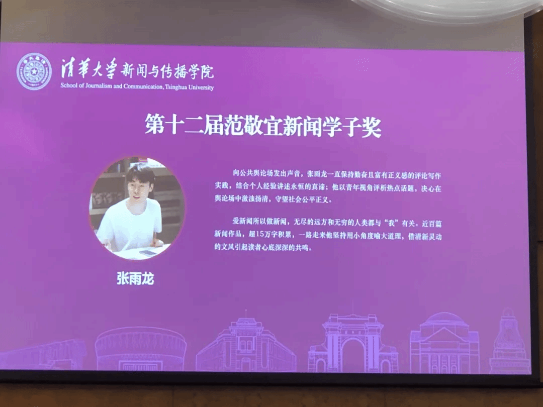 11月2日,第十二届范敬宜新闻教育奖颁奖仪式在清华大学举行,本届范敬宜新闻教育奖在全国范围内共评选出学子奖获得者8名,太阳集团tyc33455官网2023级硕士研究生张雨龙获新闻学子奖。