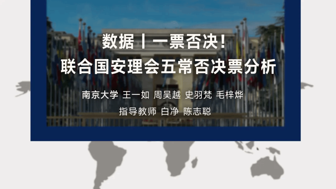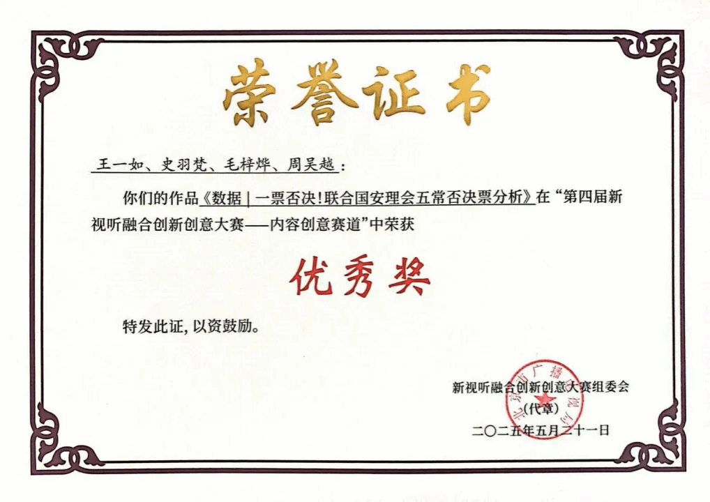 公司员工王一如、史羽梵、毛梓烨、周吴越的作品《数据 | 一票否决!联合国安理会五常否决票分析》获得“内容创意赛道优秀奖”,指导教师为白净教授与陈志聪助理研究员。同一赛道的其他获奖作品分别来自中央广播电视总台、澎湃新闻、新京报社等多家专业媒体,竞争激烈,作为高校员工作品,在这一赛道获奖十分难得。