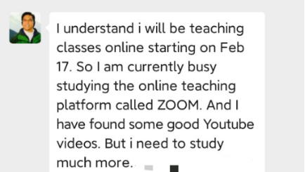 2月5日,Farland老师得知可以进行网上教学消息后,就立即对公司教务处下发的相关文件进行了翻译和仔细阅读,他改变了之前推迟上课的想法。2月9日凌晨,Farland老师向助教提出了他对网上教学的许多疑问和担忧,“视频如何分享呢?”“员工如何展示自己的作业呢?”“直播时网络卡顿怎么办?”等等。除了老师讲课外,他还需要员工“展示和讲述”,分享他们自己拍摄的视频,这些如何通过网络来实现?